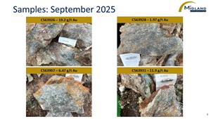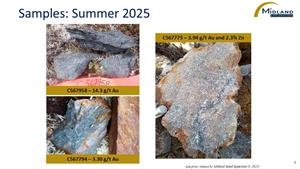 Samples with analytical values exceeding 2.0 g/t Au were collected from angular boulders. The maximum result of 24.5 g/t Au was obtained from a selected grab sample of a boulder of banded amphibolite. This specific boulder is located in the south centre of the project area, where during the previous prospecting campaign of the summer a similar boulder returned 2.76 g/t Au (see press release by Midland dated September 9, 2025). Following-up the anomalous gold-manganese results (3.94 g/t Au and 6.00 % MnO) of the earlier summer campaign in the southern centre part of the project area, selected grab samples C563926, C56393, and C563985 respectively returned analytical results of 19.2, 11.9, and 3.50 g/t Au. Field observation of these new boulders suggests a garnet-rich intrusive host rock. Follow up and resampling of the fuchsite boulder identified this summer returned a new value of 6.47 g/t Au in sample C563907. While boulders are mostly observed until now in the project area, an amphibolite outcrop in the south-western part of the project returned a value of 0.56 g/t Au from a selected grab sample.
