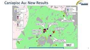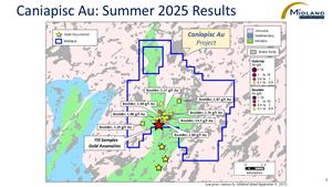 The autumn exploration program on the Caniapisc Au project was completed and included geological mapping, prospecting, a soil sampling program, and a magnetic and electromagnetic geophysical survey to follow up on the several recent Au-Zn-Mn-Ag and Au-Zn-Ag-(Pb)-bearing boulders identified during the 2025 summer program (see press release by Midland dated September 9, 2025). Outcrops are sparse due to a cover of glacial deposits, so boulder prospecting is the effective exploration technic for this environment. A total of 111 selected grab rock samples and 112 soil samples were collected during the follow-up campaign. From these rock samples, eight (8) show values greater than 2.0 g/t Au, eight (8) are between 0.5 and 2.0 g/t Au, while 24 others returned values between 0.1 and 0.5 g/t Au. Only gold results have been received so far, so metallic assemblages will be further evaluated when all the other analyses are received. Soil samples results are also pending.